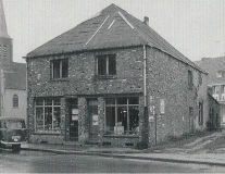 1945 - Nach Kriegsende notdürftig als einziges Haus auf der Mühlentraße (ehem. Markt 8) repariert - links Frisör Pront - rechts Kolonialwaren Claahsen & Meyer - heute Martktplatz